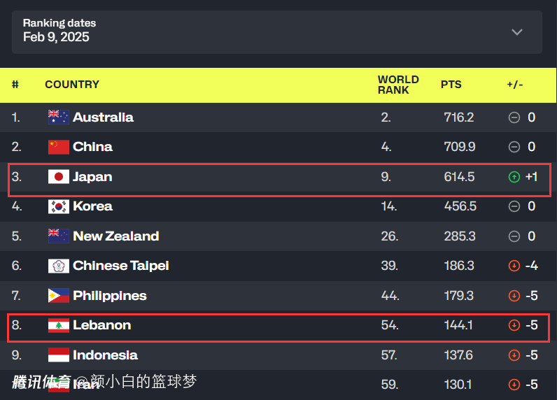 日本女篮世界排名第九,黎巴嫩世界排名第54。