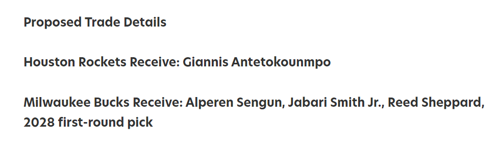 美媒模拟的交易方案是,火箭送出阿尔佩伦-申京、小贾巴里-史密斯、里德-谢泼德、2028年火箭首轮签得到字母哥,也就是4换1的交易。