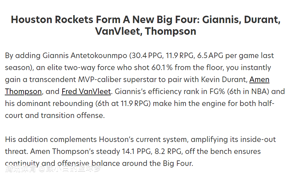 美媒认为火箭交易得到扬尼斯后等于是新的四巨头组合——阿门、范弗利特、字母哥、杜兰特。字母哥上赛季场均30.4+11.9+6.5+命中率60.1%,他是联盟最顶级的攻防双向巨星,他与杜兰特的组合可能是自1980年来奥尼尔/科比后最具统治力的组合。