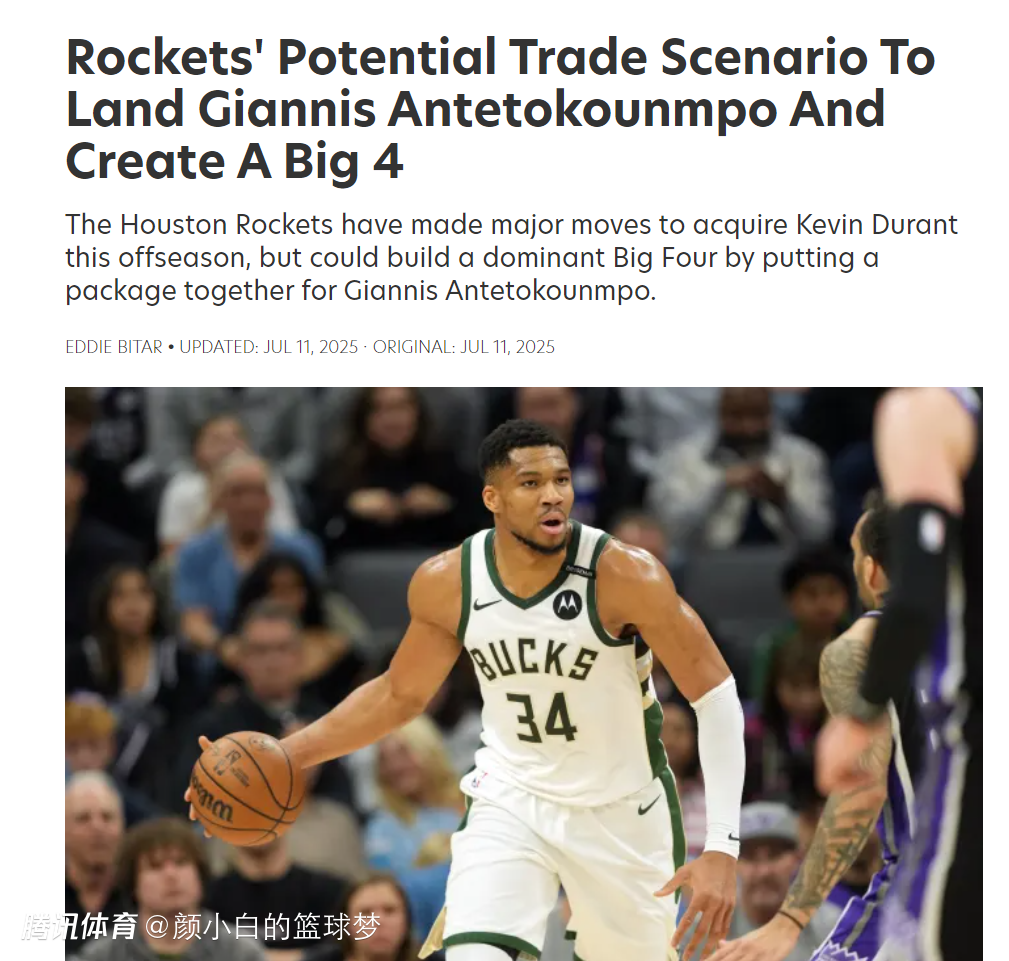 美媒建议火箭继续追扬尼斯:模拟4换1方案出申京 组字母+KD冲冠