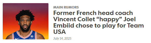 2025-07-15 06:10北京时间7月15日,根据欧媒BasketNews的报道,前法国男篮国家队主教练Vincent Collet承认,对于NBA球星恩比德选择代表美国队而非法国队参加2024年巴黎奥运会,他感到很欣慰。