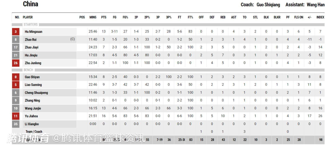 全队共有3人得分上双,余嘉豪16分10篮板,两项数据均为全队最高,胡明轩拿到13分。另外4助攻全队最高,王俊杰在16分钟的上场时间里,6投4中拿到13分6篮板。赵睿本场比赛出战11分钟,5中1仅得到3分,还有4次失误。