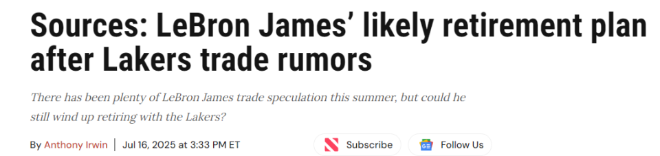 2025-07-17 06:00北京时间7月17日,湖人队记Anthony Irwin报道了詹姆斯和湖人的最新关系。Irwin表示,尽管詹姆斯对湖人近年缺乏明显方向感非常失望,但他并没有和湖人谈论买断或交易,并依然计划在洛杉矶打到退役。
