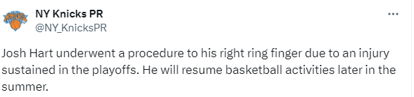尼克斯官方:哈特右手无名指手术完成 今年夏末将迎来复出