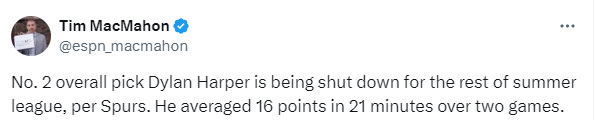 马刺榜眼秀迪伦-哈珀将缺席剩余夏联比赛 此前出战两场场均16分