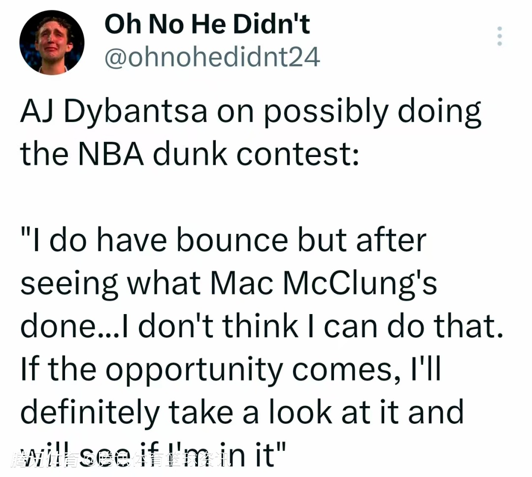 迪班萨表示:“我确实有弹跳力,但在看到麦克朗的表现后,我觉得自己做不到那样的动作。如果有机会的话,我肯定会考虑一下,看看自己是否适合参加。”