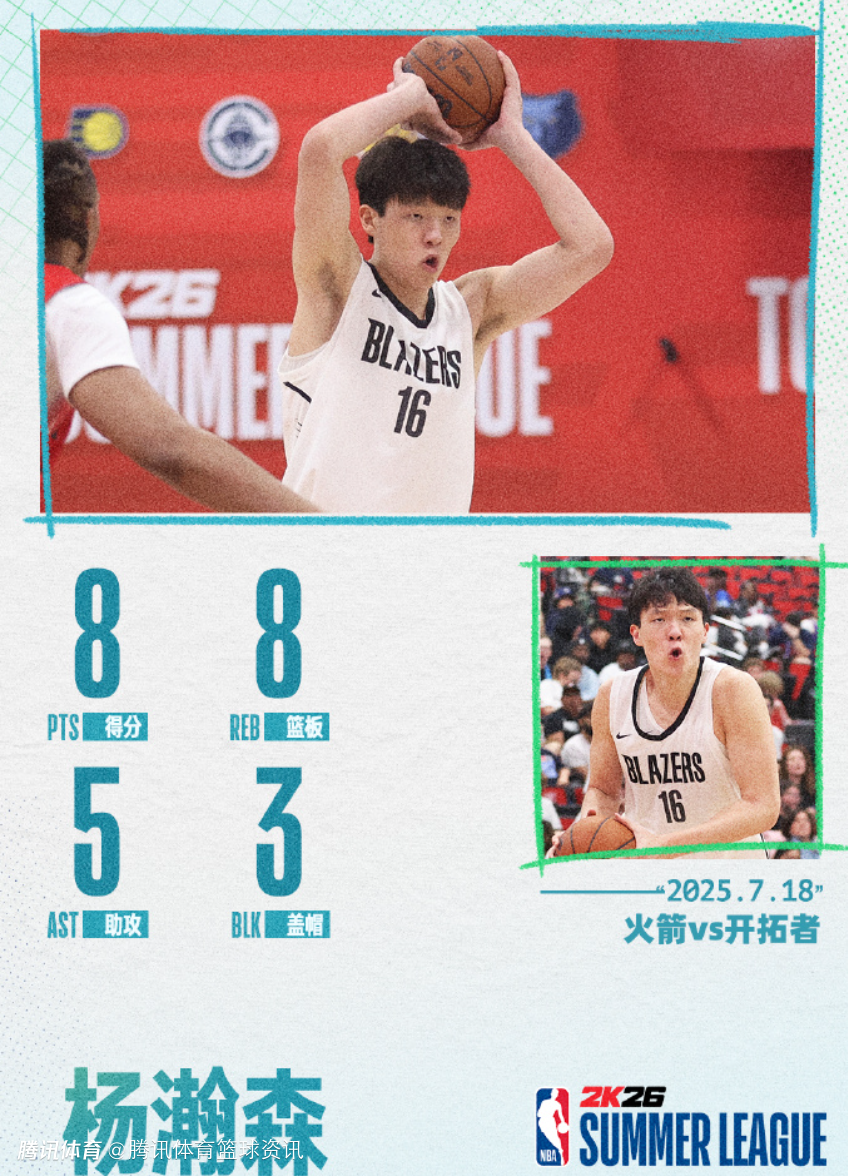 2025-07-18 11:20北京时间7月18日,NBA夏季联赛,开拓者以102-83击败火箭,此役杨瀚森继续首发,在21分钟的上场时间里,7投3中拿到8分8篮板5助攻3盖帽,正负值+19为全队次高。赛后杨瀚森接受了群采。