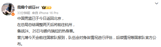 曾凡博归队!媒体人:中国男篮今日返回北京 备战与委内瑞拉的热身赛