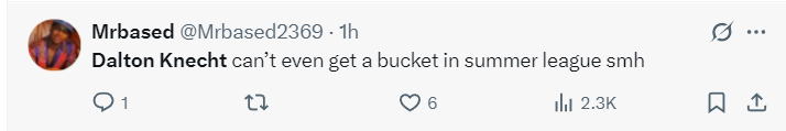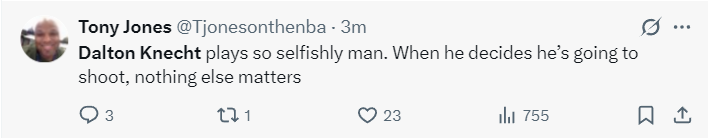 爵士记者托尼-琼斯:道尔顿-克内克特的投篮极具个人主义色彩。当他决定要投篮时,其他一切都不再重要了。