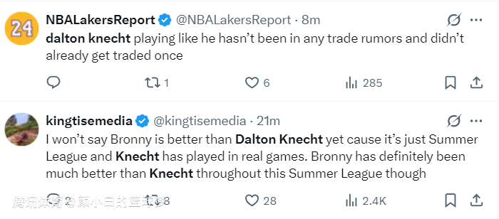 湖媒:克内克特这个表现好像湖人从未要交易似的。或许我们不能说布朗尼一定比他更强因为这只是夏联,但只看夏季联赛的话,布朗尼比克内克特出色得多。