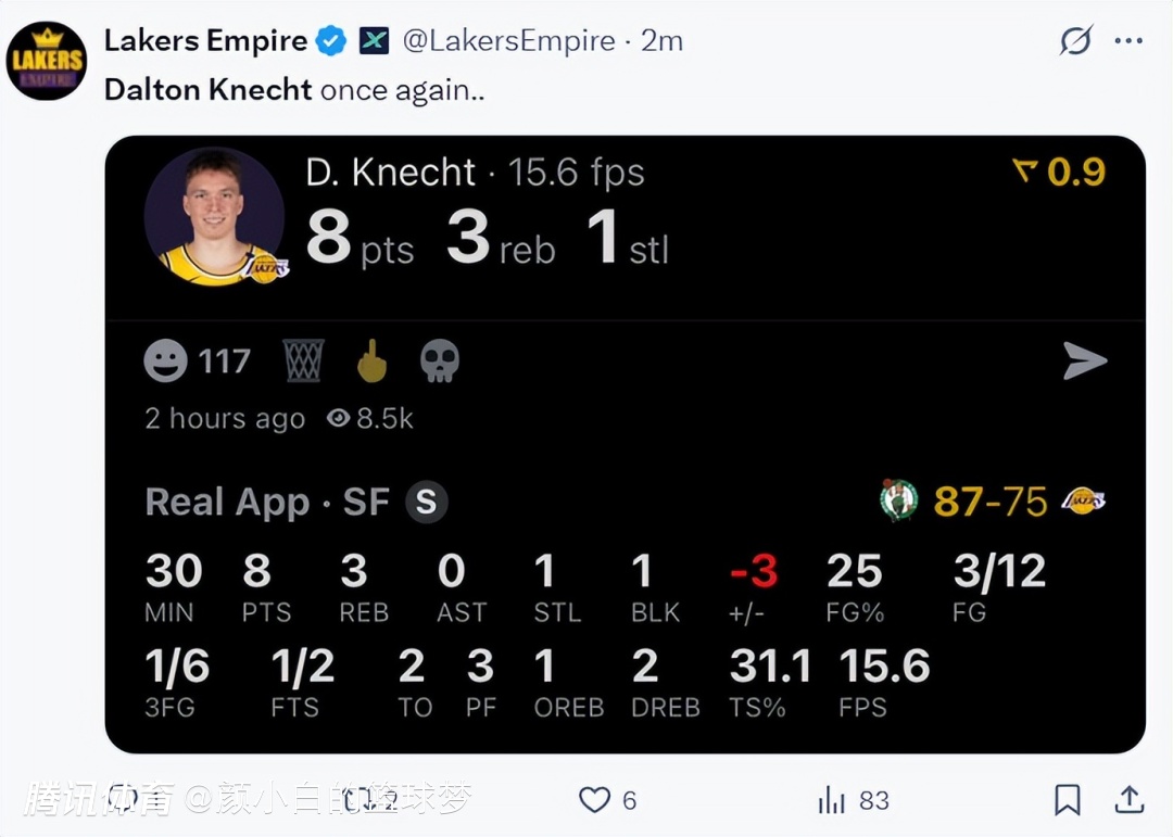 本该是夏联湖人领袖的克内克特30分钟,12中3,三分6中1,罚球2中1,拿到8分3篮板0助攻1抢断1盖帽,命中率25%,三分命中率16.7%,真实命中率31.1%。