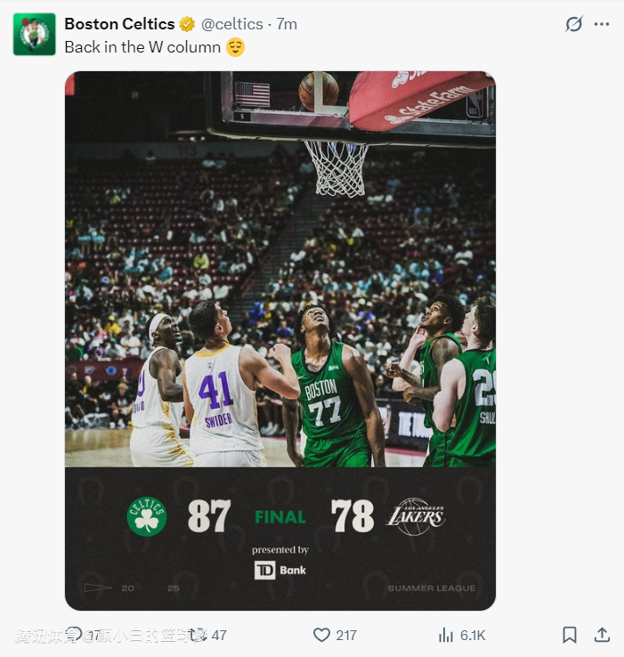 2025-07-18 11:30北京时间7月18日,凯尔特人87-78击败湖人,这场比赛湖人是被逆转的,第二节绿凯一波19-9直接打崩湖人,下半场湖人一直都处于落后的状态,太子爷布朗尼此役全队比拿到18分5助攻3篮板1抢断,得分是全队最高。