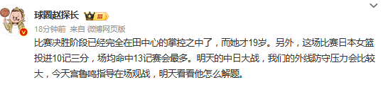 媒体人赵探长发文点评:比赛决胜阶段已经完全在田中心的掌控之中了,而她才19岁。另外,这场比赛日本女篮投进10记三分,场均命中13记赛会最多。明天的中日大战,我们的外线防守压力会比较大,今天宫鲁鸣指导在场观战,明天看看他怎么解题。