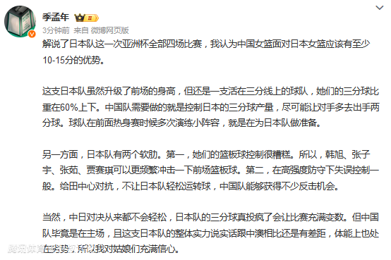 媒体人季孟年 发文点评说道:我认为中国女篮面对日本女篮应该有至少10-15分的优势。