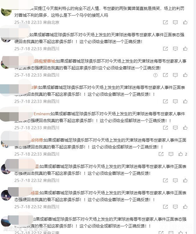 不仅如此,成都蓉城官方账号的战报评论区也被刷屏,球迷纷纷要求成都蓉城就韦世豪家人被侮辱一事表态。球迷们纷纷要求成都蓉城为韦世豪发声,写道:“如果蓉城俱乐部不对这场比赛场上发生的天津球迷侮辱韦世豪家人事件正面表态强硬回击,我真的看不起这家俱乐部!这个必须给全蓉球迷一个正确反馈!”