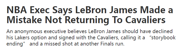 这位NBA高管说道:“我不会坐在这儿让别人拒绝超过5000万美元的合同,但詹姆斯是个亿万富翁啊,兄弟。他有足够的钱,场外收入也够多。如果我是他团队的人,我会建议他放弃湖人队的球员选项,签约骑士队。这才是明智之举。”