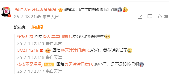 战胜成都蓉城之后,津门虎官方社媒发文表示,“双杀!倍儿爽!”有球迷表示,“谁能给我看看轮椅姐姐说了嘛?”天津津门虎FC回应,“看那玩干嘛”。