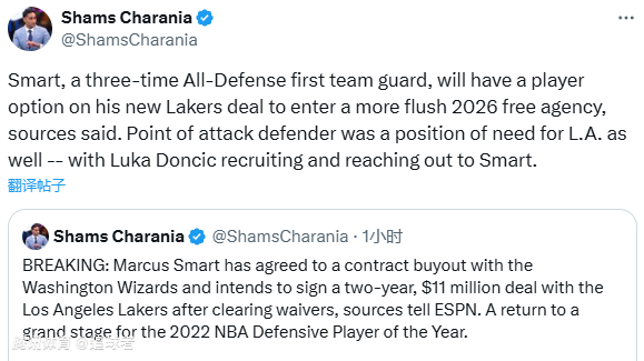 据ESPN名记shams报道,斯玛特已经同意和华盛顿奇才队达成买断,他将在澄清期后以2年1100万美元合同加盟洛杉矶湖人队,新合同最后一年为球员选项,以便其2026年进入自由球员市场。