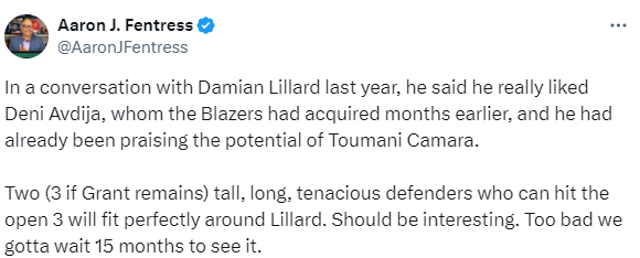 开拓者队记:利拉德欣赏阿夫迪亚与卡马拉 潜在完美组合需等15个月亮相