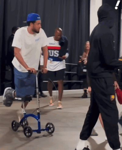 在昨天的WNBA全明星单项赛,哈利伯顿就有来到现场,即便目前仍然处于跟腱伤势的恢复期,但他仍然穿着厚重的保护靴,借助着小轮车来到现场观战。