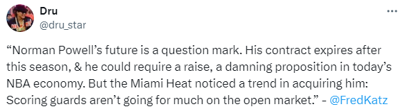 Fred Katz写道:“鲍威尔的未来仍是个问号。他的合同将在本赛季结束后到期,而且他可能会要求涨薪。在如今的NBA经济环境下,这是个棘手的问题。但热火队在引进他时注意到一个趋势:得分后卫在自由市场上的身价并不高。”
