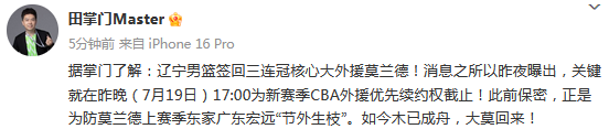 2025-07-20 10:50北京时间7月20日,根据沈阳广播电视台主持人“田掌门Master”爆料,辽宁男篮签回三连冠核心大外援莫兰德!消息之所以昨夜曝出,关键就在昨晚(7月19日)17:00为新赛季CBA外援优先续约权截止!此前保密,正是为防莫兰德上赛季东家广东宏远“节外生枝”。如今木已成舟,大莫回来。