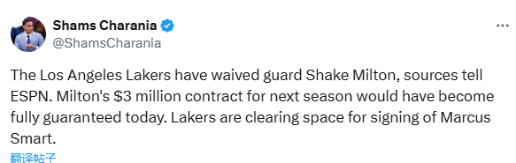 目前,斯马特已经正式与奇才达成买断协议,为了签下斯马特,湖人队已经开始操作了,据名记shams报道,湖人已经裁掉了谢克-米尔顿,后者300万美元的无保障合同,原本应该在今天转为保障合同;不过湖人裁掉米尔顿,薪资空间仍旧不够签下斯马特。