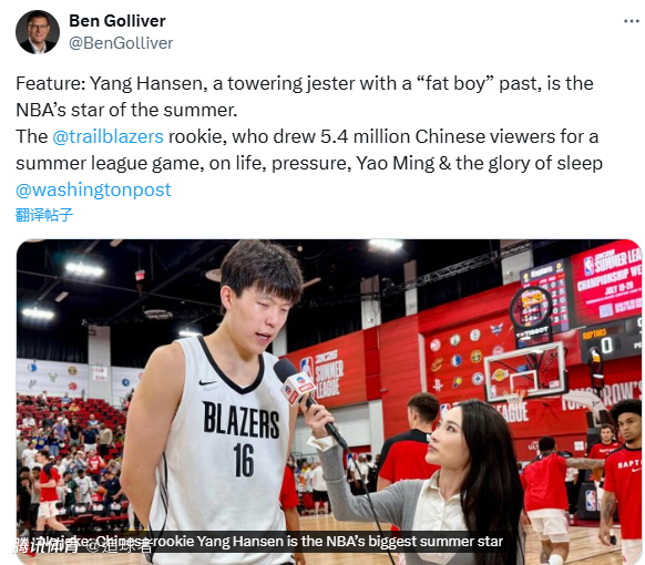 据Ben Golliver报道,一位NBA官员称,在中国,开拓者对阵灰熊的夏季联赛,仅一个转播平台的免费观看人数就达到了520万,远远超过了美国人在ESPN上观看状元弗拉格独行侠首秀的人数(110万人)。即使是转播平台付费的夏季联赛,一场比赛也吸引了340万观众,是以往平均观看人数的16倍。而在CCTV,杨瀚森的夏季联赛比赛的平均观看人数超过了CCTV今年NBA季后赛全部转播的观看人数。