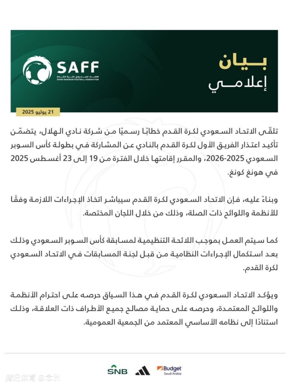 官宣:新月退出沙超杯