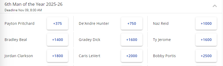 上赛季的最佳第六人普里查德,依然是新赛季这一奖项的领跑者。他的赔率是+375,随后是亨特(+750)、纳兹-里德(+1000)、比尔(+1400)、迪克、杰罗姆(同为+1600)、克拉克森(+1800)、勒维尔(+2000)和波蒂斯(+2500)。