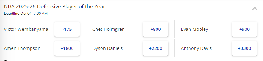 榜单上只有6名球员,文班亚马(-175)遥遥领先,毕竟上赛季要不是文班提前赛季报销,不符合65场规则,这个奖项肯定属于他。霍姆格伦(+800)排名第二。2024-25赛季的获奖者莫布利(+900)位居第三。其他上榜的包括阿门-汤普森(+1800)、丹尼尔斯(+2200)和浓眉(+3300)。