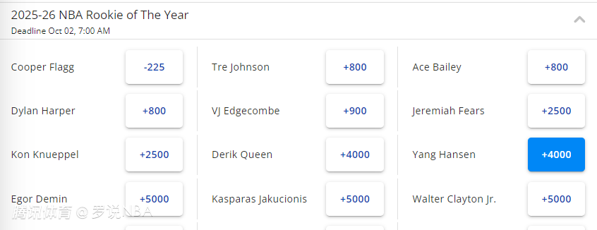 弗拉格(-225)处于明显的领跑位置,特雷-约翰逊、贝利、哈珀(同为+800)并列第二。随后是探花埃奇库姆(+900)、费尔斯和克努佩尔(同为+2500)。杨瀚森凭借出色的夏联表现,排名飙升到第8,和德里克-奎因同为+4000。德明、雅库乔尼斯和小克雷顿同为+5000。