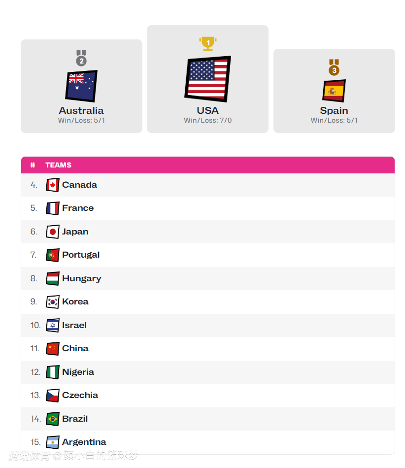 U19世界杯 :美国女篮四连冠 完整1-15排名西班牙第3中国第11