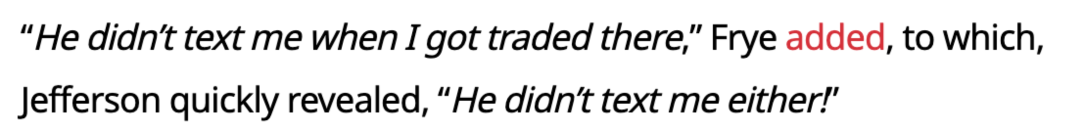 弗莱说道:“当我被交易至骑士时,他没有给我发短信。”杰弗森也补充道:“他也没给我发短信。”随后杰弗森也回忆到16年弗莱加盟骑士前,自己和詹姆斯的谈话:“勒布伦前一天问我,他说‘伙计,你觉得弗莱这人咋样?’,我就说‘你会恨死他,然后又会爱死他,等着瞧吧。’”