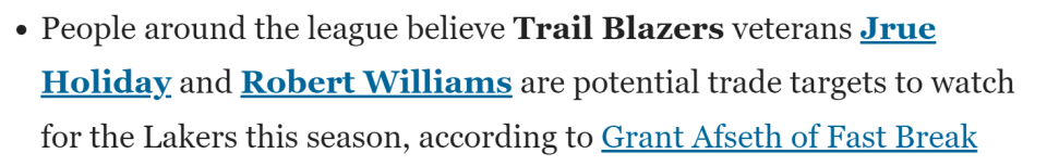 NBA内部人士中还有一种说法是,湖人队可能会考虑将交易范围扩大,把罗伯特-威廉姆斯也纳入其中。据消息人士透露,这位27岁的球员合同还剩一年,薪资为1330万美元,此前就曾引起湖人队的兴趣。罗威可以为湖人队在艾顿身后提供更稳固的前场力量,并能让海耶斯更适合担任第三中锋的角色。