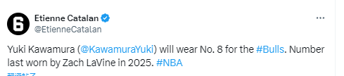 Etienne Catalan写道:“河村勇辉将身披芝加哥公牛队的8号球衣。该号码的上一位使用者是2025年的扎克-拉文。”在上赛季的交易截止日,拉文通过多方交易被送到了国王队。