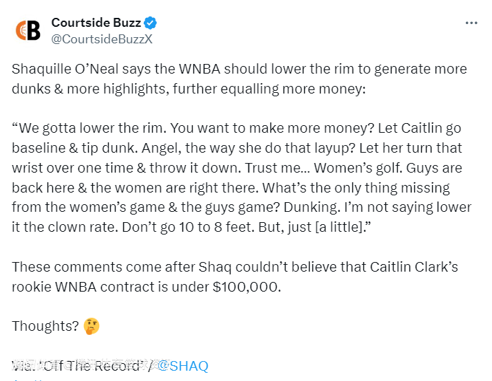 2025-07-21 22:50北京时间7月21日,前NBA球星沙奎尔-奥尼尔表示,WNBA 应该降低篮筐高度,以增加扣篮次数和精彩瞬间,进而带来更多收益。