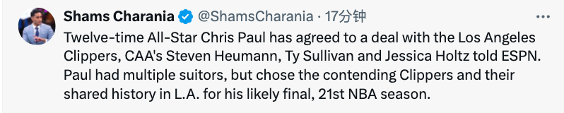 2025-07-21 23:30北京时间7月21日,据名记Shams报道,保罗已经同意和快船签约,据悉有多支球队追求保罗,但他在自己的最后一个赛季,还是选择了具备争冠实力的老东家快船,随后名记Haynes跟进报道,保罗签下的是一份1年360万的合同。
