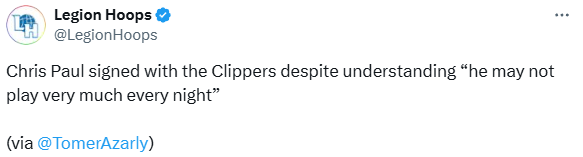 快船队记Tomer Azarly报道,保罗明白自己在快船不会有太多上场时间,因为球队拥有成熟而有深度的阵容,但保罗还是决定回归快船,保罗有机会出场,快船希望能平衡队内球星的上场时间。