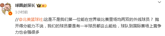 媒体人赵探长发文点评说道:这是不是我们第一位能在世界级比赛里场均两双的外线球员? 抛开得分能力不说,我们的球员要是有一半球员都这么能抢,球队到国际赛场上的竞争力也会强很多。
