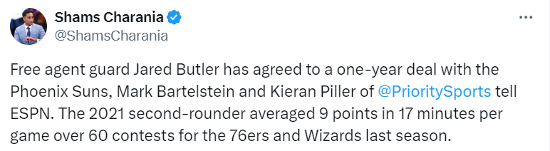 Shams:贾里德-巴特勒与太阳达成一年协议 球员上赛季先后效力奇才76人