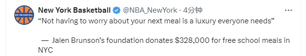 2025-07-24 08:30北京时间7月24日,尼克斯队球员杰伦-布伦森的基金会捐赠32.8万美元,用于为纽约市的学校提供免费餐食。