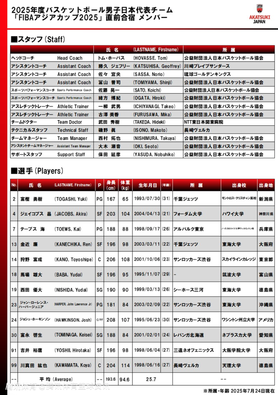 2025-07-24 13:50北京时间7月24日,日本男篮公布亚洲杯最终12人名单,马场雄大、富永启生和富坚勇树回归,河村勇辉未在其中。