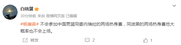 杨瀚森不参加与委内瑞拉两场热身赛 月底对阵波黑两场也大概率不打