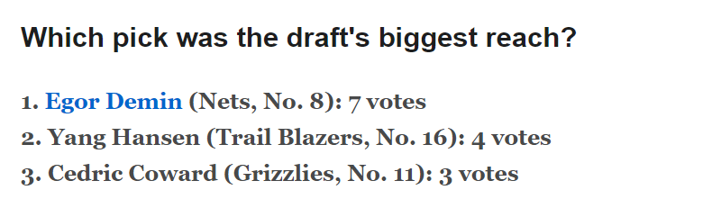 2025-07-24 21:10北京时间7月24日,ESPN邀请20位NBA高管和球探对新秀相关话题进行投票,在“谁将成为本届最大选秀失误(指高顺位选了低潜力球员)”一项中,杨瀚森得到4票,排名第二,得到最多票数的是篮网的8号秀德明,他得到7票。灰熊的11号秀考沃德得到3票,排在第三。以下是ESPN相关解析——