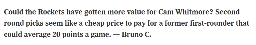 当时还有其他几支球队为惠特莫尔开出了涉及次轮签的报价,火箭本可以轻易地把他交易到其中任何一支队伍。但惠特莫尔的经纪人团队把球员发展放在首位,不希望过去两个赛季的情况重演。火箭最终选择了一个离他的家近的目的地,而且这支球队正处于重建阶段,与他当前的目标相符。这也是当时能达成的最好交易了。