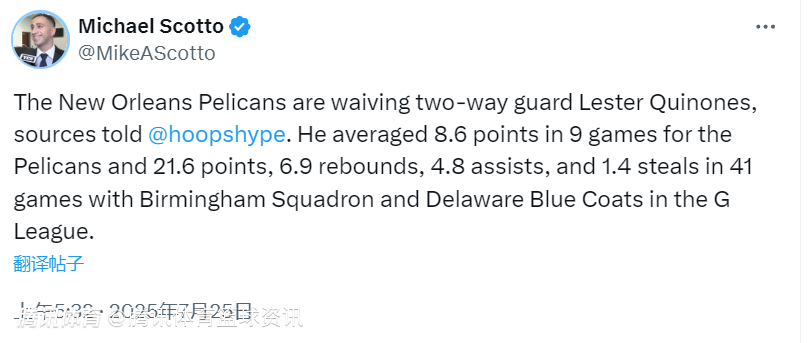 2025-07-25 06:30北京时间7月25日,根据记者Michael scotto报道,鹈鹕队已裁掉后卫奎诺内斯。