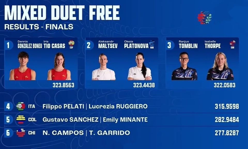 西班牙组合冈萨雷兹/提奥.卡萨斯表现突出,以323.8563摘得金牌;中立组合马尔采夫/普拉托诺娃以0.4125分之差摘银,铜牌归属英国组合汤比林/索普,成绩是322.0583。