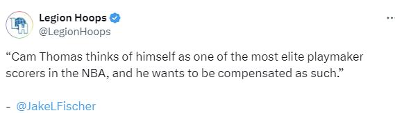 该记者表示:“卡姆-托马斯认为自己是NBA中最顶尖的持球得分手之一,并且他希望能得到与之匹配的报酬。”