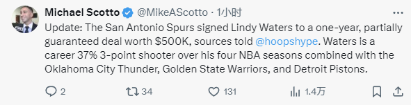 该记者写道:“据消息人士透露,圣安东尼奥马刺队已与林迪-沃特斯签下一份为期一年、部分保障的合同,价值50万美元。在效力于俄克拉荷马城雷霆队、金州勇士队和底特律活塞队的四个NBA赛季中,沃特斯的职业生涯三分球命中率为37%。”